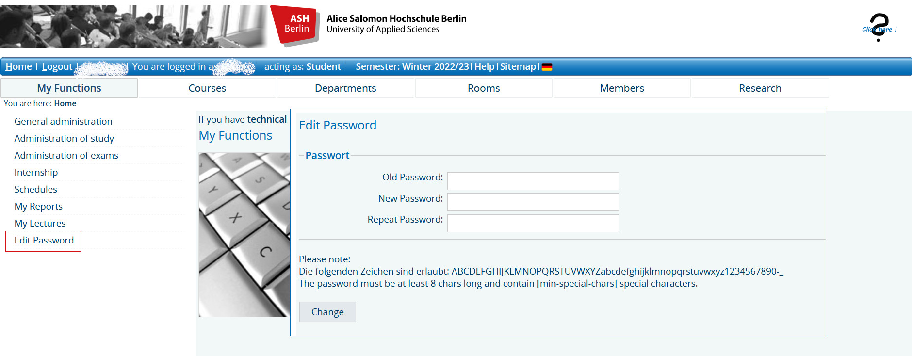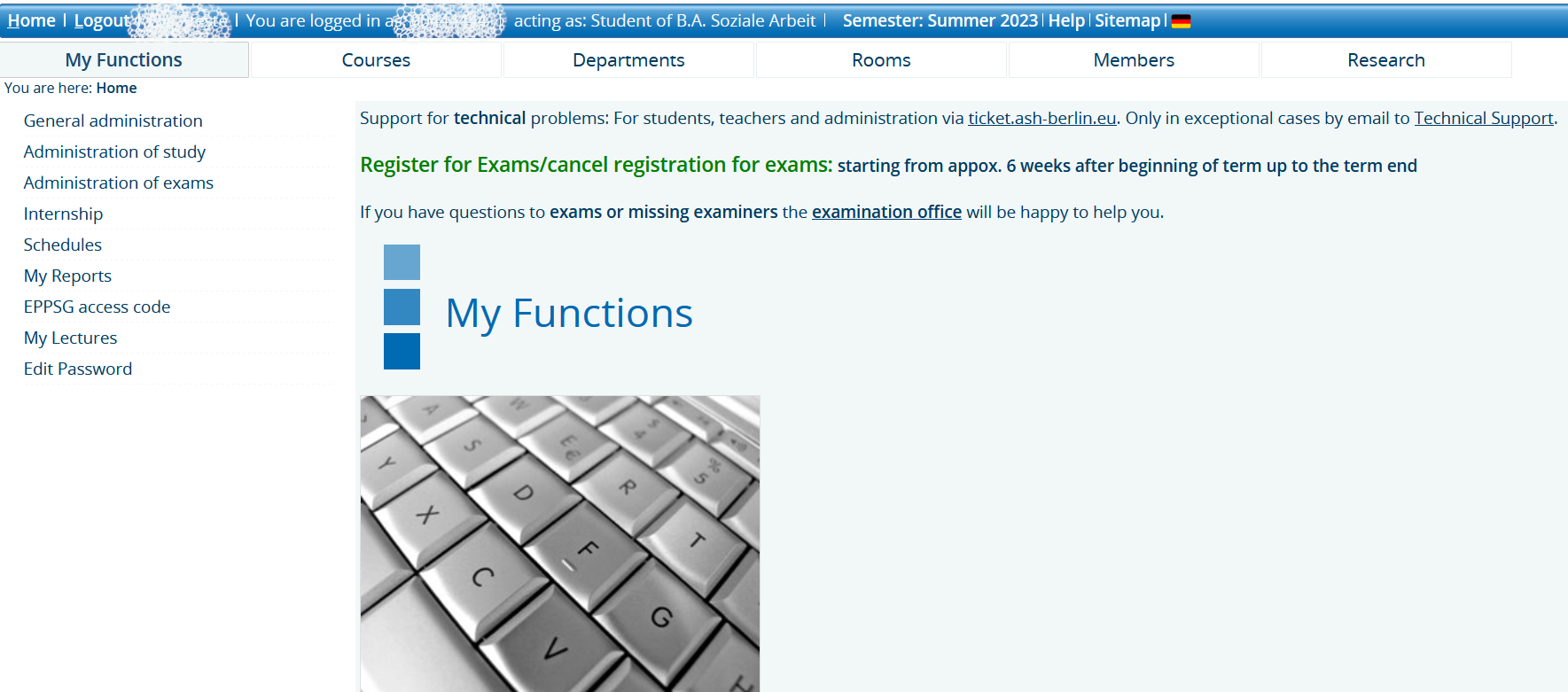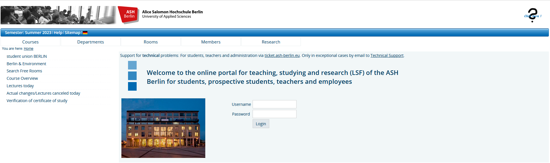 Start up the enrolment system via https://www.ash-berlin.eu/lsf or open the startpage ASH and follow the link Vorlesungsverzeichnis. This will open the home page of the enrolment system:
