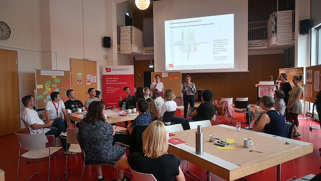 Im Anschluss diskutierten die Teilnehmenden an zwei interaktiven Thementischen zu den Schwerpunkten Erfahrungen und Visionen von Qualität sowie wesentliche Facetten und Handlungsfelder von Qualitätsentwicklung. Die angeregten und konstruktiven Diskussionen verdeutlichten ein ausgeprägtes Interesse am Thema Qualitätsentwicklung sowie einen großen Bedarf, Positives zu stärken und bereits Vorhandenes sichtbar zu machen, zu bündeln und auszubauen sowie Erfahrungs- und Expert_innenwissen zu berücksichtigen. Transparenz - Standards - Struktur - klar geregelte, leicht auffindbare Zuständigkeiten und Abläufe - Stimmigkeit - Nachvollziehbarkeit - Professionalisierung - Serviceorientierung erwiesen sich als wiederkehrende Themen und Anliegen, die im Zusammenhang mit Qualitätsvisionen für die ASH Berlin genannt wurden. Diese können in Verbindung mit ausgewählten Maßnahmen und Prinzipien (z.B. Onboarding, Beschwerdemanagement, Gestaltung von Curricula und Lernorten, Studierendenzentrierung und Partizipation von Studierenden) zu einer erhöhten Zufriedenheit von Hochschulmitgliedern sowie zum Schließen von Qualitätskreisläufen beitragen. Hierbei wurde die Bedeutung von Digitalisierung als dringend notwendiger Baustein zur Qualitätsentwicklung an der Hochschule betont. Deutlich gemacht wurde auch, dass der Aufbau einer hochschulweiten Qualitätskultur des Commitments und der Verantwortungsübernahme von Akteuer_innen quer durch alle Handlungsfelder auf zentraler und dezentraler Ebene der Hochschule bedarf.